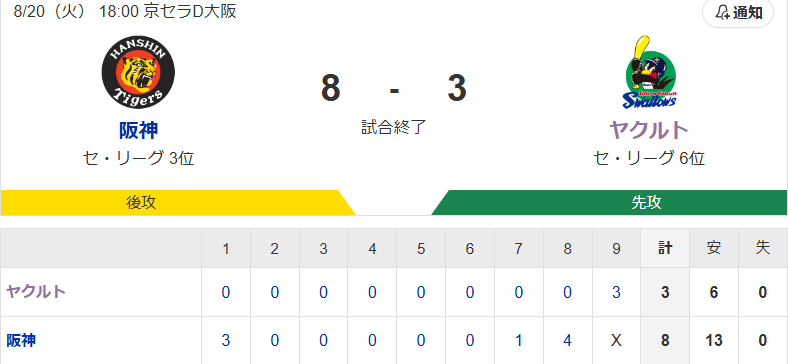 【試合結果】ヤクルト3-8阪神 吉村・山野が4失点 太田オスナタイムリーも反撃間に合わず スポンサーリンク 東京ヤクルトスワローズ 2024/08/20 22:55 【試合結果】ヤクルト3-8阪神 吉村・山野が4失点 太田オスナタイムリーも反撃間に合わず 523: 神8-3ヤ(9回表) 24/08/20(火) 20:57:16 ID:I2O1 あまりにも弱い 続きを読む