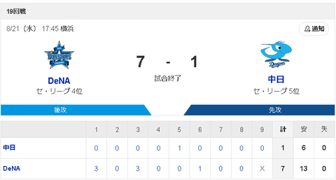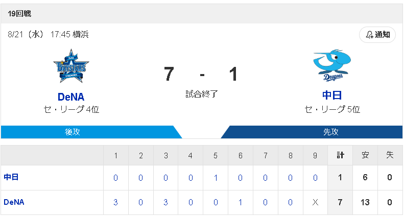 DeNA 3 0 3 0 0 1 0 0 X |7