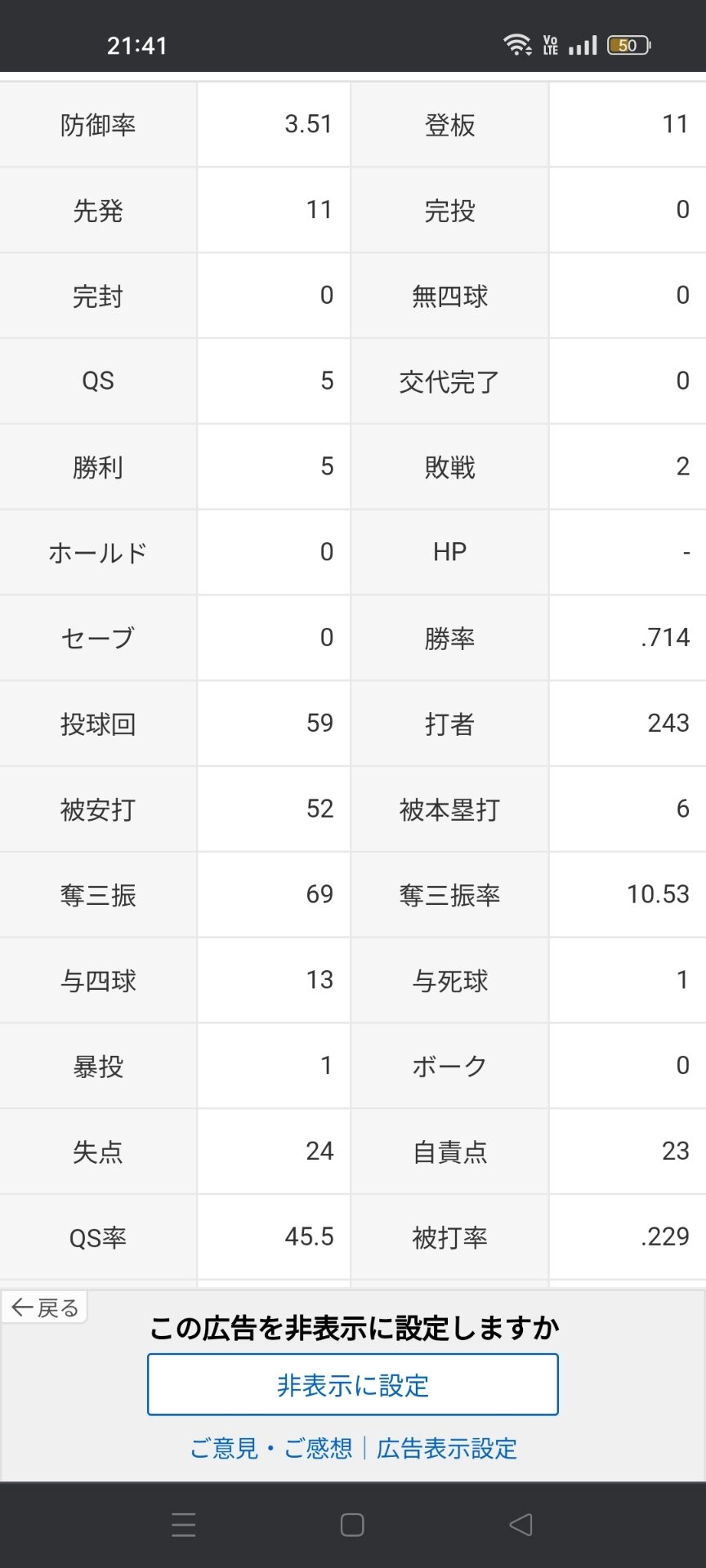 山本由伸「5勝2敗 防御率3.51 投球回59 奪三振率10.53 whip1.10」←これについての率直な感想