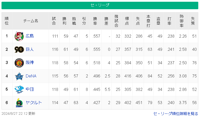 【悲報】阪神タイガースさん、球団史上初の連覇に黄色信号・・・ スポンサーリンク 阪神タイガース 2024/08/28 13:34 【悲報】阪神タイガースさん、球団史上初の連覇に黄色信号・・・ (出典 【悲報】阪神タイガース 球団史上初の連覇に黄色信号) 1 それでも動く名無し 警備員[Lv.3][新芽] :2024/08/27(火) 22:32:18.15 ID:s8Wdiy780 現在首位まで4ゲーム差 (出典 【悲報】阪神タイガース 球団史上初の連覇に黄色信号) 続きを読む