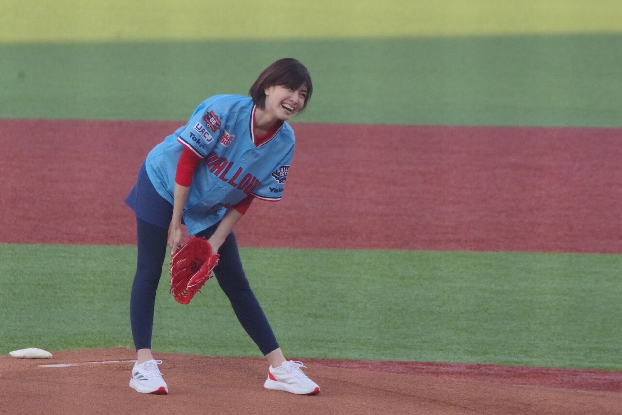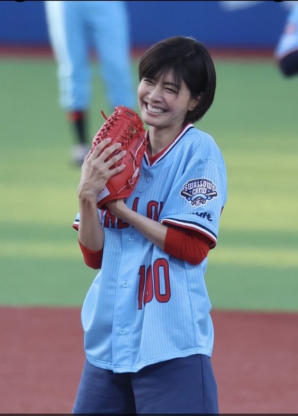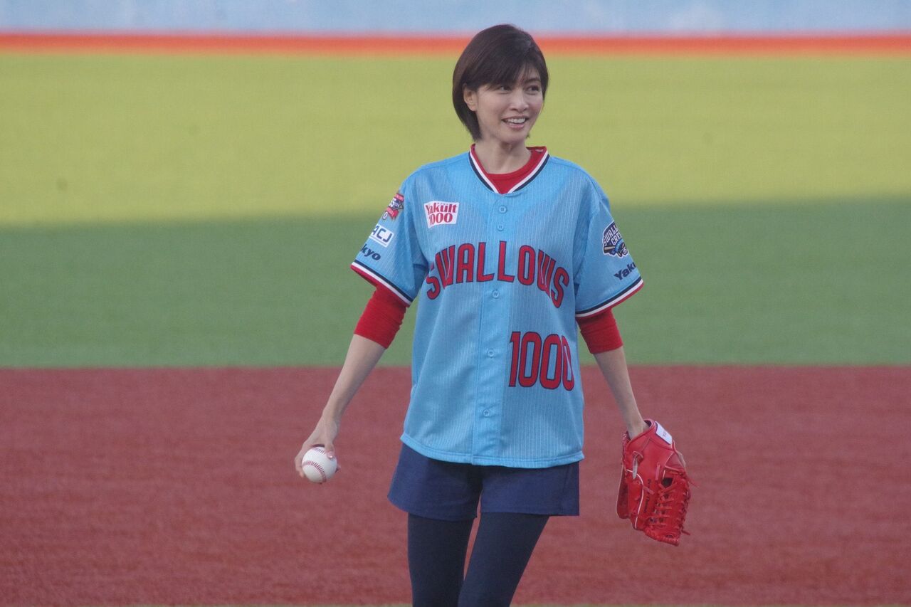 【画像】内田有紀(48)さん、神宮ヤクルト戦で始球式
