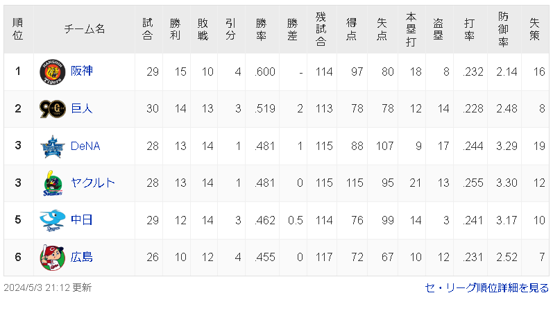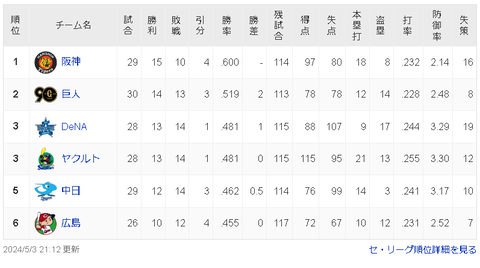 【5/3】神==巨-//-横ヤ-中広【順位スレ】 スポンサーリンク 中日ドラゴンズ 2024/05/04 00:03 【5/3】神==巨-//-横ヤ-中広【順位スレ】 (出典 ●●広島●●中日●東京●横浜 読売○阪神○○○○○) 1 それでも動く名無し 警備員[Lv.10(前21)][苗] :2024/05/03(金) 20:52:28.64 ID:DQyLyVcO0 阪神○○○○○ 読売○ 横浜● 東京● 中日●● 広島●● 福岡○○○○○○○○○○ 日公○○○○○ 楽天● 檻牛●●● 千葉●●● 西武●●●●●●●● (出典 ●●広島●●中日●東京●横浜 読売○阪神○○○○○) 続きを読む