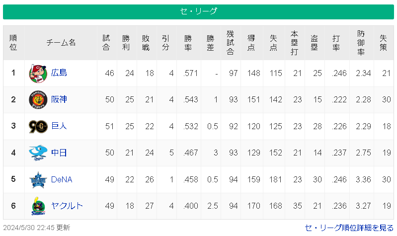 【5/30】広=神-巨=-/-=中-横==-ヤ【順位スレ】 スポンサーリンク 中日ドラゴンズ 2024/05/31 00:44 【5/30】広=神-巨=-/-=中-横==-ヤ【順位スレ】 (出典 ●●●●●●●●●東京●●●●横浜●●●中日 読売○○○阪神○○○○広島○○○○○○) 1 それでも動く名無し 警備員[Lv.8] :2024/05/30(木) 22:21:20.35 ID:q0rA94S2d 広島○○○○○○ 阪神○○○○ 読売○○○ 中日●●● 横浜●●●● 東京●●●●●●●●● 福岡○○○○○○○○○○○○○○○ 日公○○○○○○○○○ 千葉○○○○○○○ 檻牛●●●●●●● 楽天●●●●●●● 西武●●●●●●●●●●●●●● (出典 ●●●●●●●●●東京●●●●横浜●●●中日 読売○○○阪神○○○○広島○○○○○○) 続きを読む