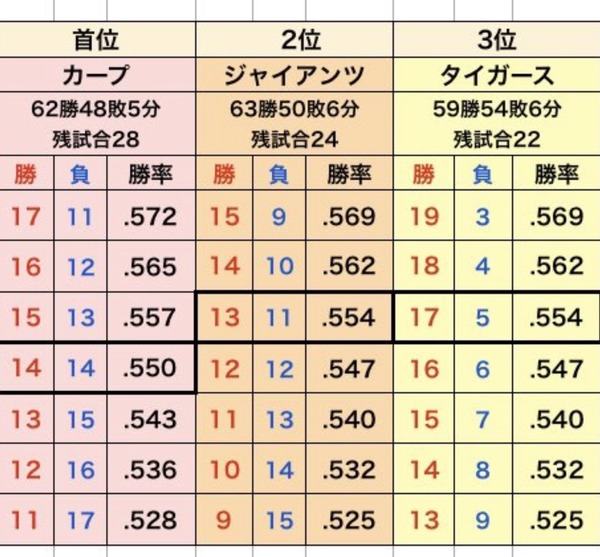 令和最新版セリーグ優勝ライン スポンサーリンク 東京ヤクルトスワローズ 2024/09/03 16:13 令和最新版セリーグ優勝ライン 1: それでも動く名無し 警備員[Lv.6][新芽] 2024/09/02(月) 20:36:01.88 ID:cY/9Uqf40 s://i.imgur.com/w5qfNTI.jpeg 直接対決 広島v巨人 マツダ6試合 阪神vs巨人 甲子園2試合 続きを読む