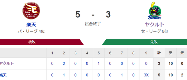 【試合結果】ヤクルト3-5×楽天 フランコに逆転サヨナラ3ラン被弾…引き分け挟んで4連敗 スポンサーリンク 東京ヤクルトスワローズ 2024/05/31 22:33 【試合結果】ヤクルト3-5×楽天 フランコに逆転サヨナラ3ラン被弾…引き分け挟んで4連敗 242: 楽2-3ヤ(9回裏) 24/05/31(金) 21:36:50 ID:SCyi なにやってんねん 続きを読む