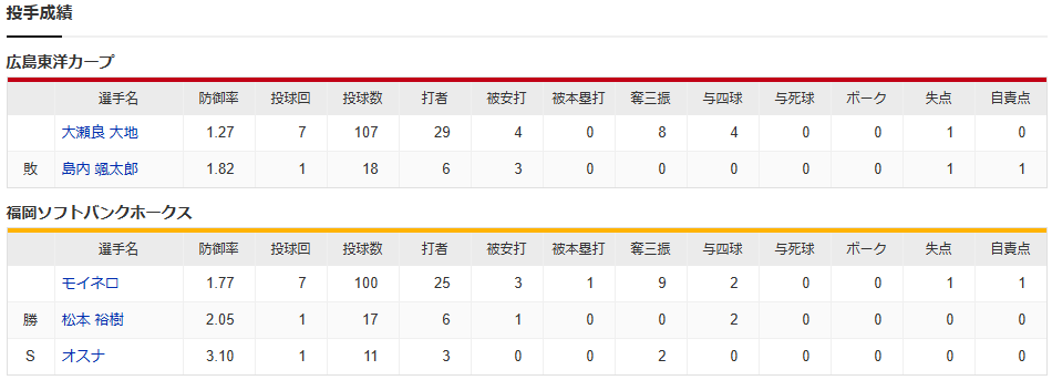 カープ大瀬良7回0自責点!菊池3号!島内痛恨1失点でプロ野球タイ記録の月間12ホールド逃す【広島1-2ホークス/試合結果】