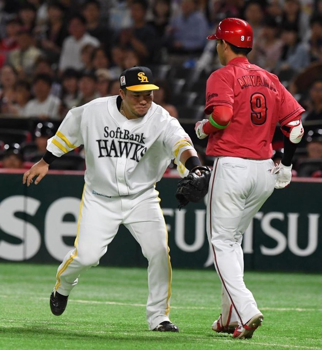 広島 秋山がまさかの逆走w山川が追いかけてタッチし苦笑い 元西武戦士がほっこりシーン 試合前には談笑も