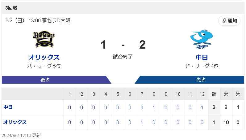 中日 0 0 0 0 0 0 0 1 0 0 0 1|2