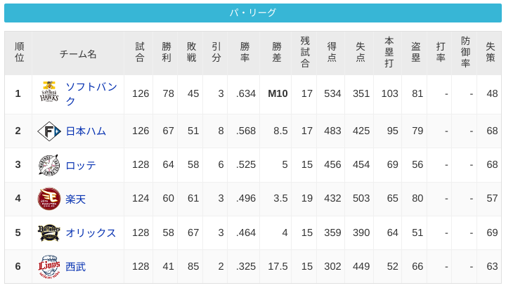 パーソル パ・リーグ 順位表 (9/13)⚾️