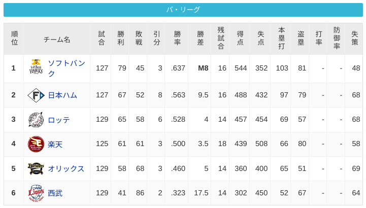 パーソル パ・リーグ 順位表 (9/14)⚾️