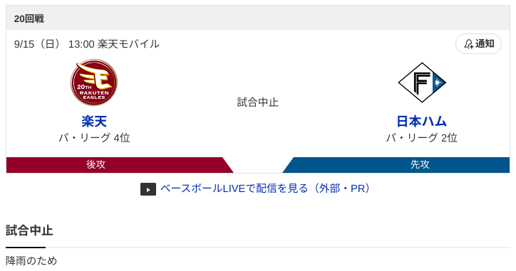 【楽天vs.日本ハム 20回戦 】雨天のため、中止になりました。 スポンサーリンク 北海道日本ハムファイターズ 2024/09/15 14:04 【楽天vs.日本ハム 20回戦 】雨天のため、中止になりました。 続きを読む