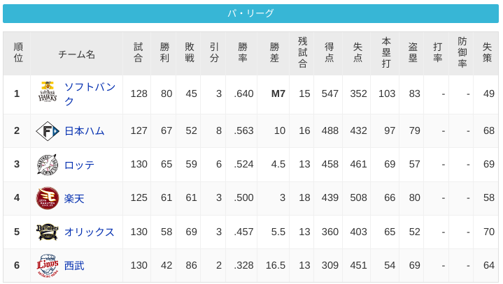 パーソル パ・リーグ 順位表 (9/15)⚾️
