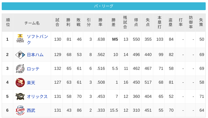 パーソル パ・リーグ 順位表 (9/17)⚾️