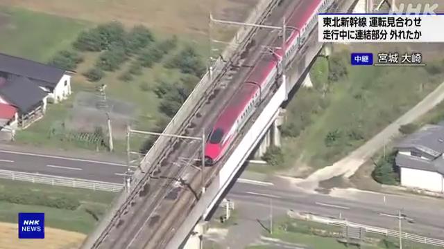 JR東日本によりますと、東北新幹線は宮城県の古川駅と仙台駅の間で、車両の連結部分が走行中に外れ停車しているということです