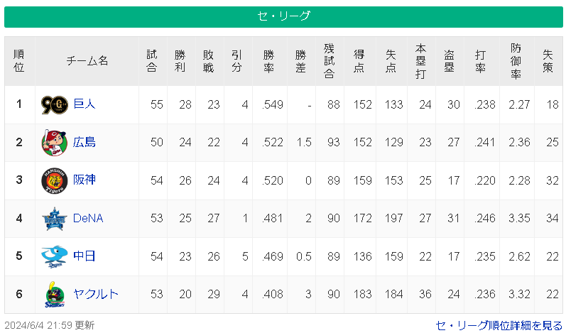 【6/4】巨-=広神=/=横-中===ヤ【順位スレ】