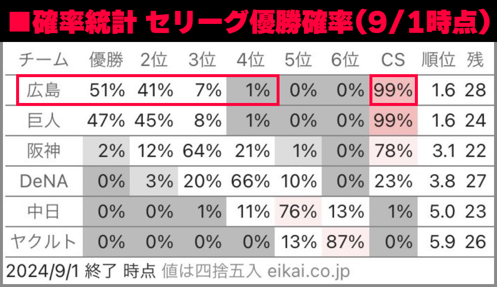 カープが優勝を逃し4位転落する確率『1%』だった。9月「4勝16敗」で確率統計学を破壊