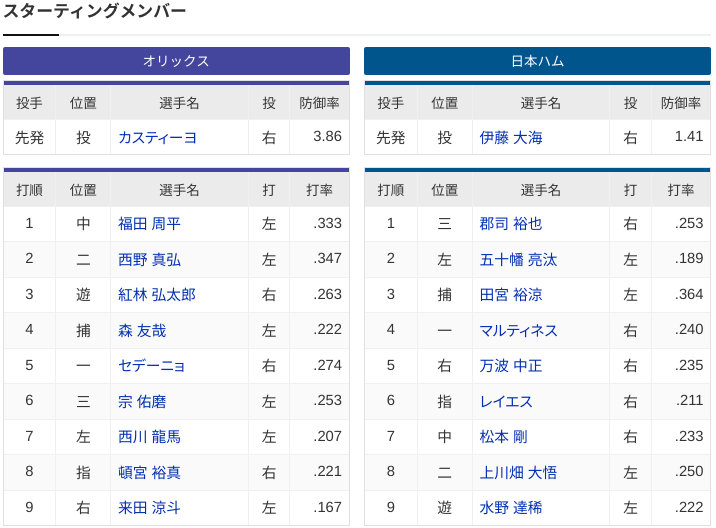 【オリックスvs.日本ハム 9回戦 】1(三)郡司裕也 2(左)五十幡亮汰 3(補)田宮裕涼 4(一)マルティネス