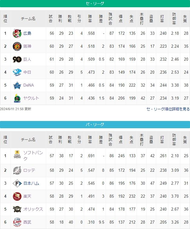 交流戦順位表(6月11日)ロッテ完封負けで初の借金突入、楽天が劇的逆転サヨナラ勝ちで10勝到達 スポンサーリンク 千葉ロッテマリーンズ 2024/06/12 01:24 交流戦順位表(6月11日)ロッテ完封負けで初の借金突入、楽天が劇的逆転サヨナラ勝ちで10勝到達 16: 名無し 24/06/11(火) 21:44:38 ID:3WD9 【朗報】セリーグ、パのホームで互角の戦い本日3勝3敗 2024交流戦セ35勝(2分)パ40勝 続きを読む