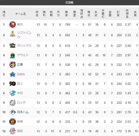 パリーグ球団の交流戦前と現在の貯金借金差がやばい…