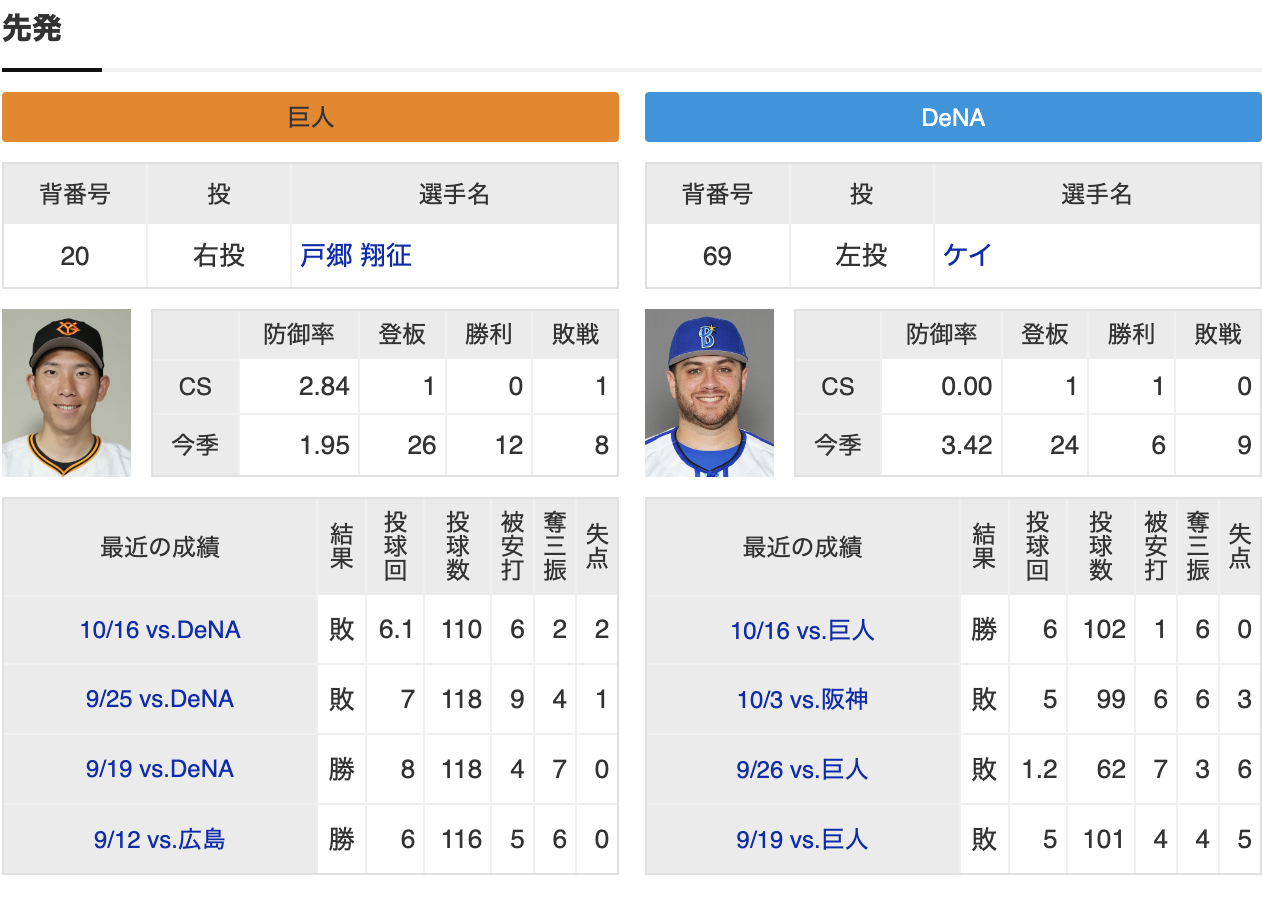 一方のDeNAはケイが先発マウンドに上がる。第1戦では6回1安打無失点の好投を披露し、チームに勝利をもたらした。今日の大一番でも相手打線を封じ、7年ぶりの日本シリーズ進出を決めたいところだ。
