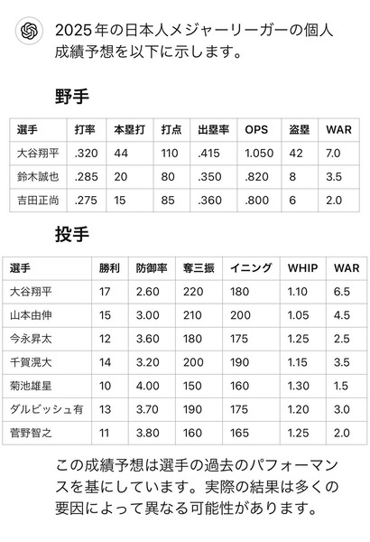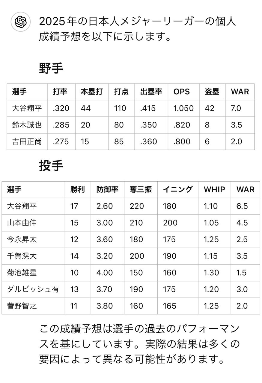 来季の日本人メジャーリーガーの成績をチャットGPTに予想させた結果wwww スポンサーリンク 東京ヤクルトスワローズ 2024/10/28 01:53 来季の日本人メジャーリーガーの成績をチャットGPTに予想させた結果wwww 1: それでも動く名無し 警備員[Lv.6][新芽] 2024/10/24(木) 01:32:02.77 ID:HIeGXAAe0 ええ感じやん🤩 imgur.com/jBPIrzt.jpeg 続きを読む