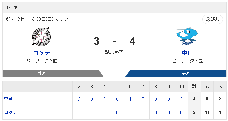 ロッテ  0 0 1  1 0 0  1 0 0  0 |3